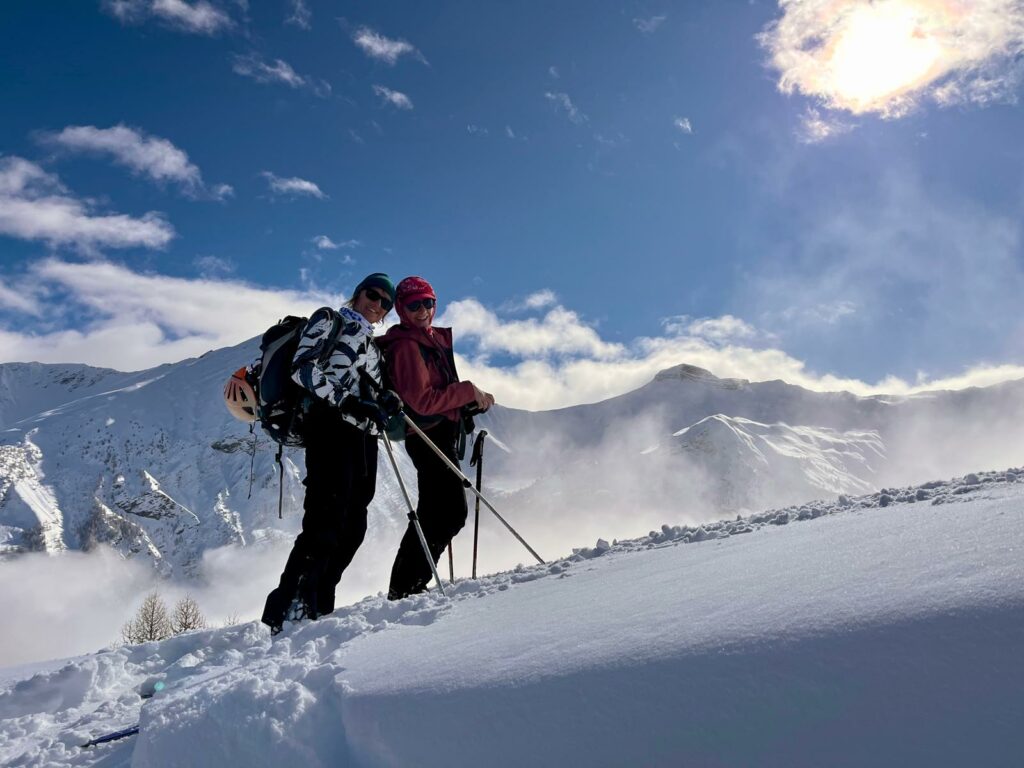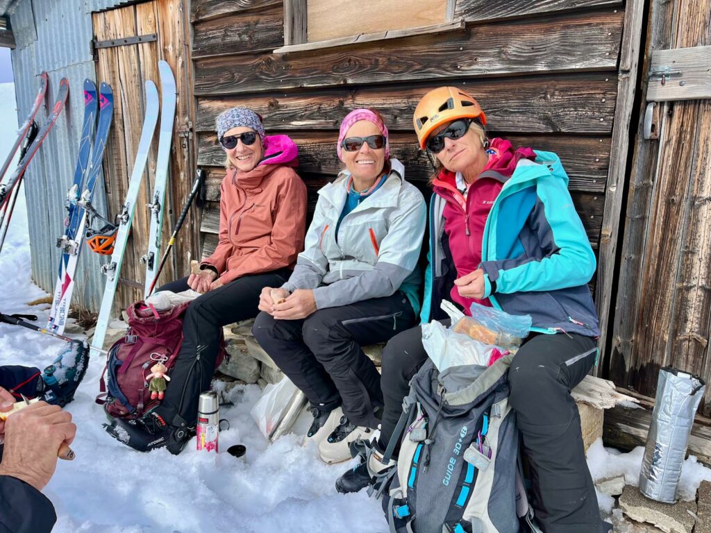 La descente se fera en face sud puis Est dans la poudreuse 5 * et dans une neige plus lourde vers 1800m. Les nouvelles recrues du Gan sont d’excellentes skieuses, ça promet !