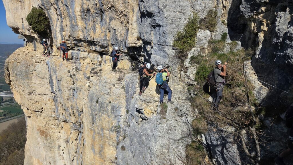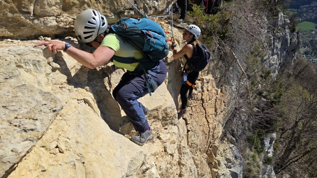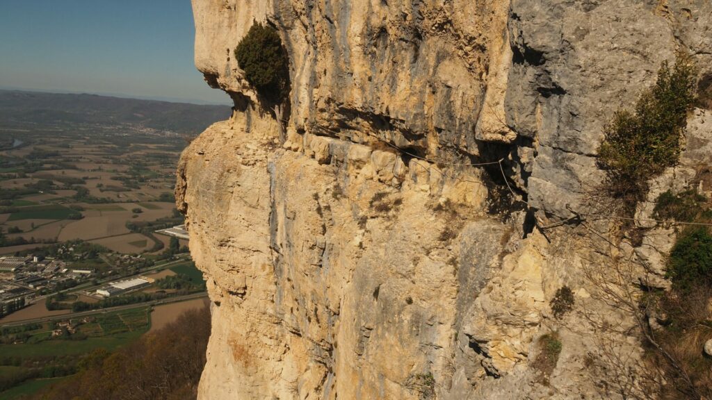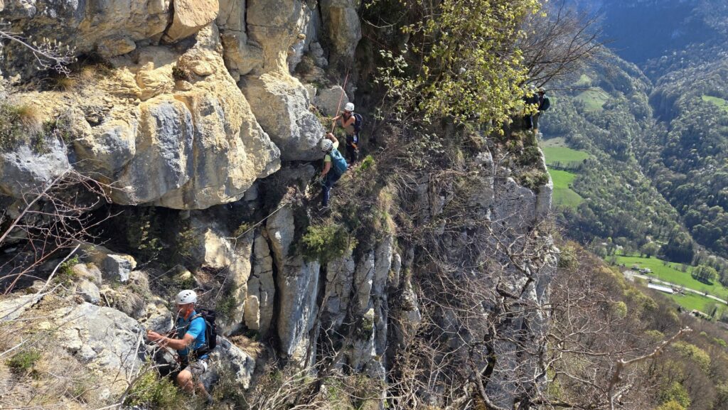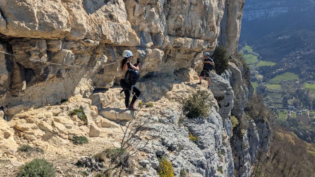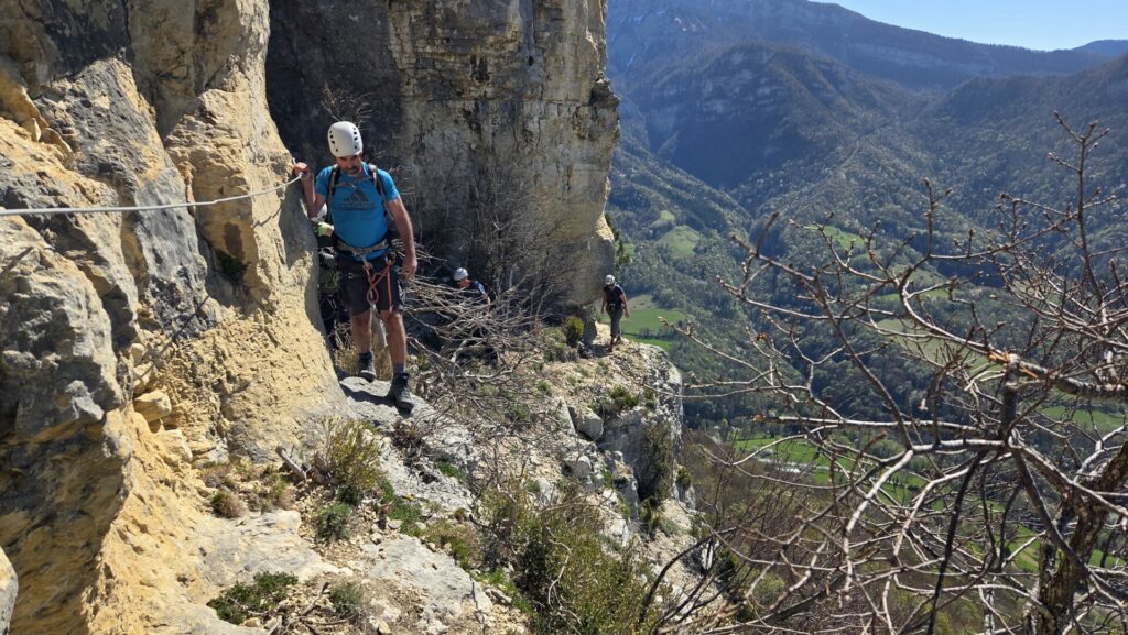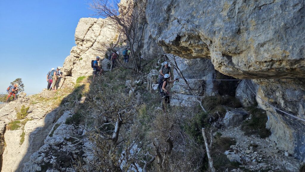 La vire est magnifique, dans un beau rocher ocre ; elle est utilisée par les grimpeurs pour accéder aux voies. Des cordes, parfois quelques bons cables, protègent les passages délicats car la vire est parfois (très) étroite. Après une petite grotte, le niveau de difficulté monte, avec une section sans corde, puis quelques passages aériens. Bizarre, ça bavarde moins.