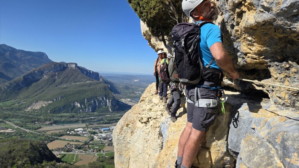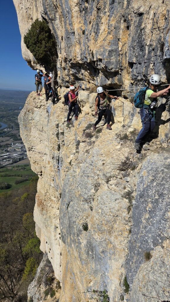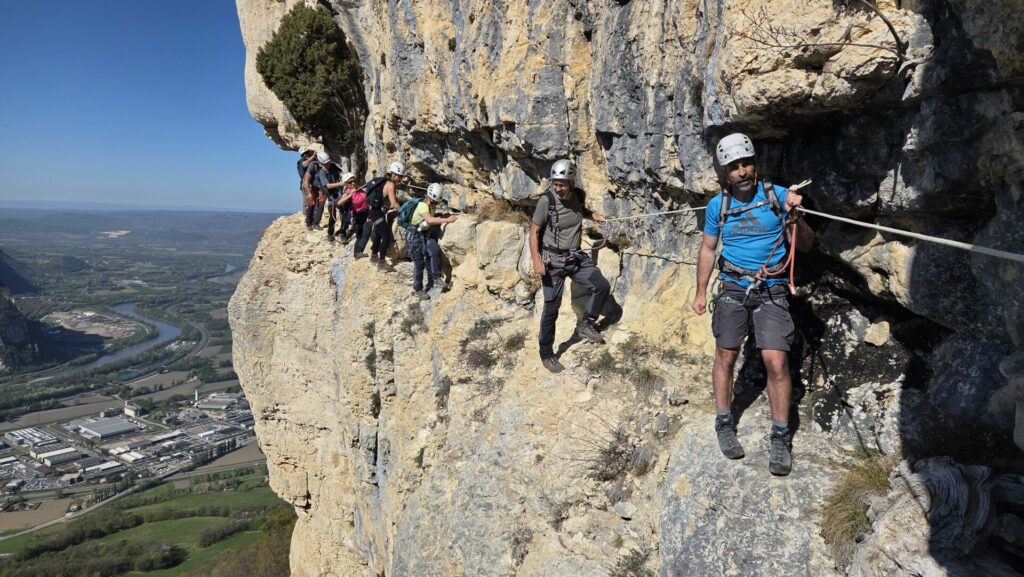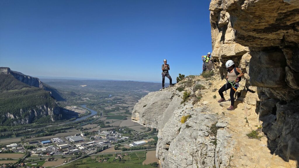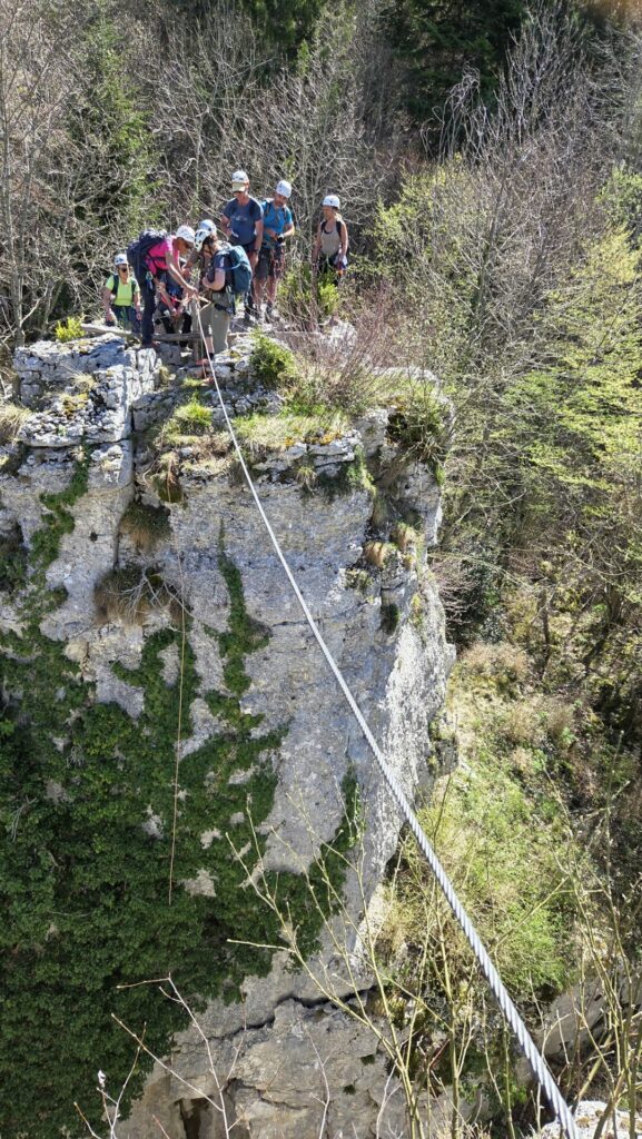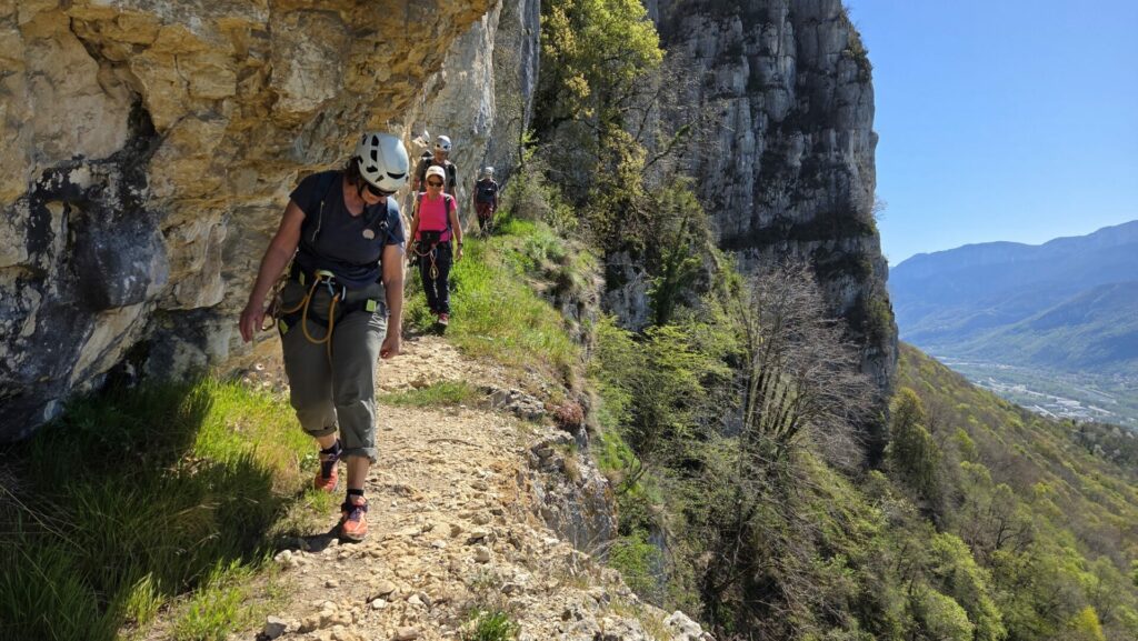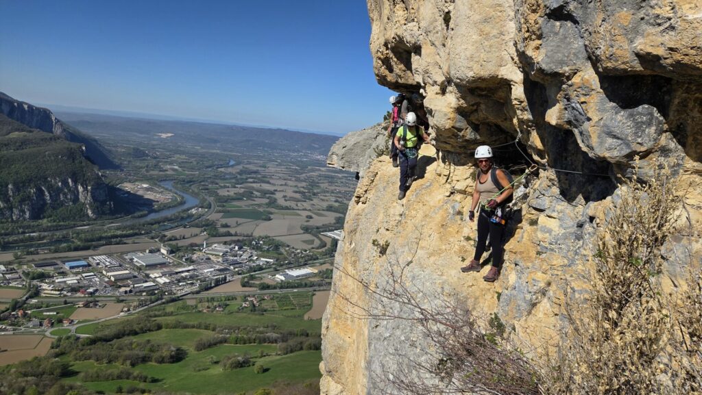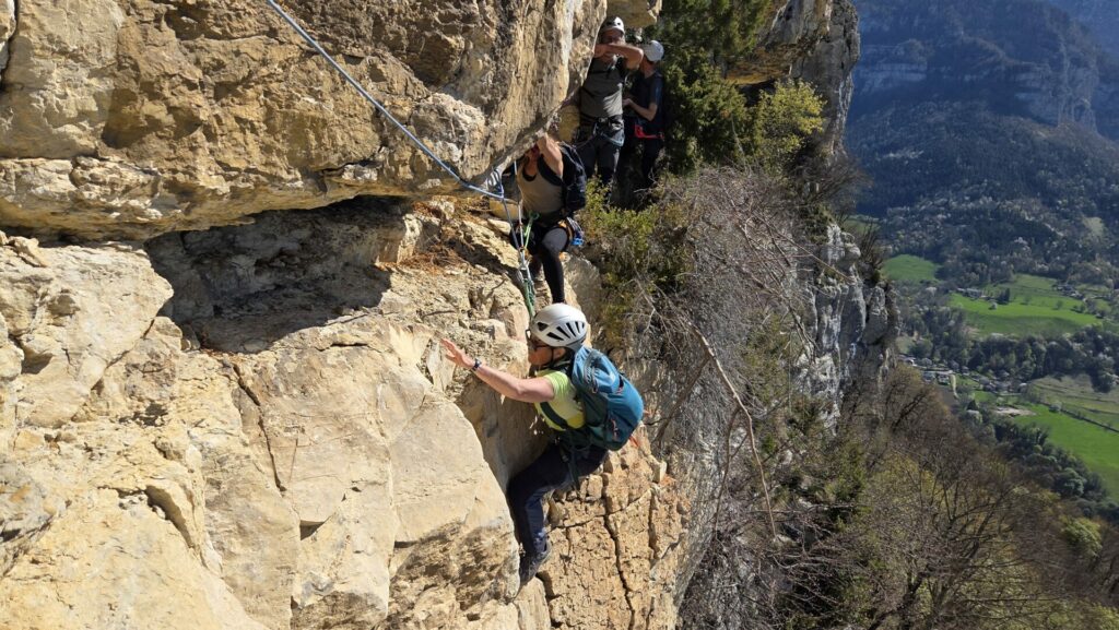 La vire est magnifique, dans un beau rocher ocre ; elle est utilisée par les grimpeurs pour accéder aux voies. Des cordes, parfois quelques bons cables, protègent les passages délicats car la vire est parfois (très) étroite. Après une petite grotte, le niveau de difficulté monte, avec une section sans corde, puis quelques passages aériens. Bizarre, ça bavarde moins.