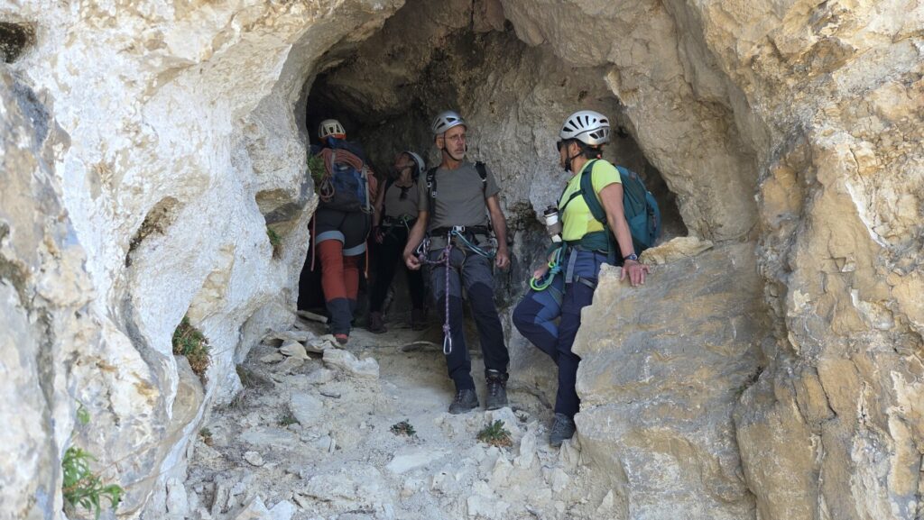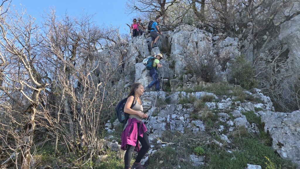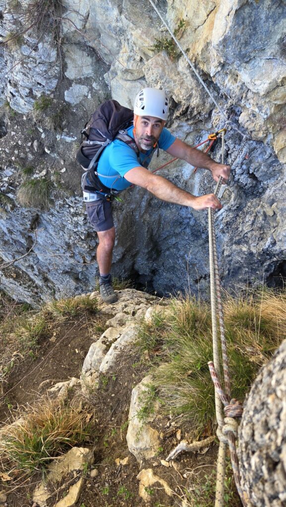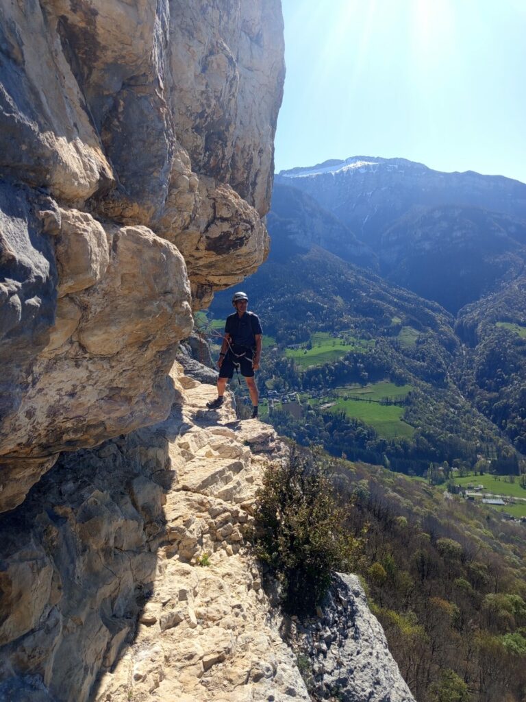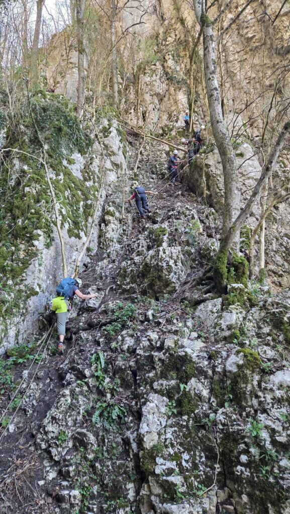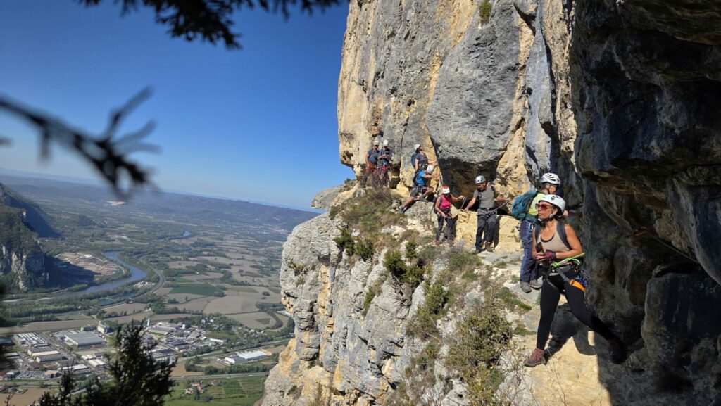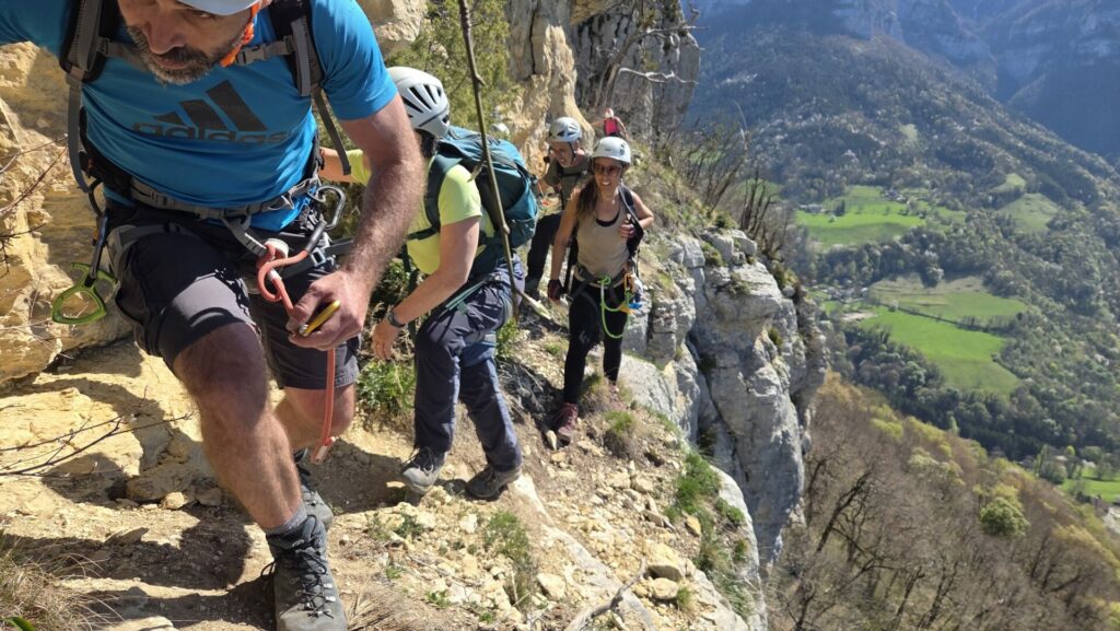 La vire est magnifique, dans un beau rocher ocre ; elle est utilisée par les grimpeurs pour accéder aux voies. Des cordes, parfois quelques bons cables, protègent les passages délicats car la vire est parfois (très) étroite. Après une petite grotte, le niveau de difficulté monte, avec une section sans corde, puis quelques passages aériens. Bizarre, ça bavarde moins.