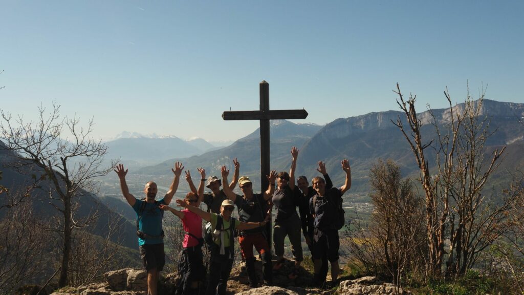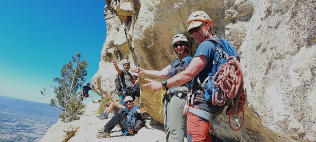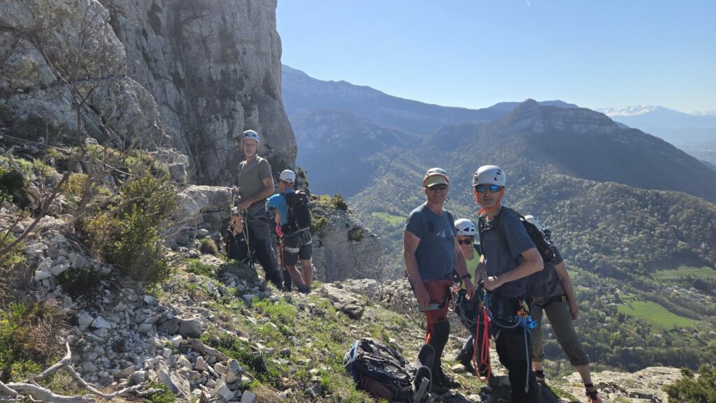 Nous sommes 9 pour cette aventure. Nous remontons en bavardant (précision inutile, ça bavardera toute la journée !) vers la croix de Roche Brune. Après une petite pause pour admirer le paysage (et bavarder), nous suivons vers l’ouest le bord de la falaise, par une sente descendante. Deux cordes nous amènent au début de la vire supérieure. On s’équipe.