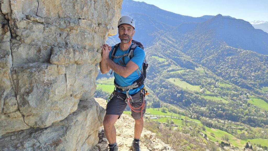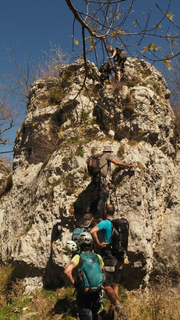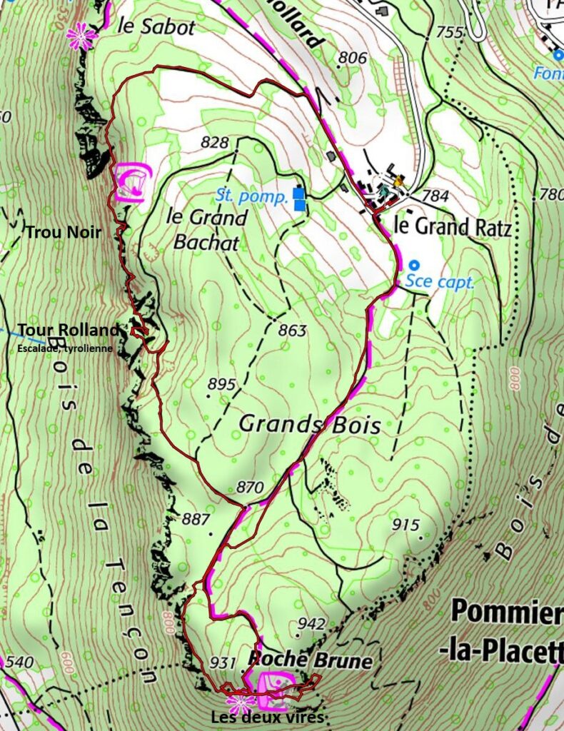A force de fureter, de défricher, et d’arpenter le Grand Ratz, Sombardier, au fil des ans, a recensé nombre de curiosités jusqu’à enchainer cet itinéraire que nous parcourons aujourd’hui. Il parcours les deux vires de Roche Brune, une dans un sens, l’autre dans l’autre, puis l’escalade de la tour Rolland, la traversée en tyrolienne sur un câble, la redescente dans une gorge profonde, puis la vire du trou noir, la visite de la grotte du trou noir, et enfin le retour au Grand Ratz. Enchainement à la fois ludique, varié, extrêmement plaisant par cette belle journée de printemps.
