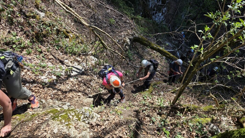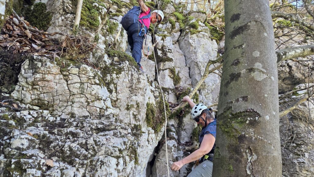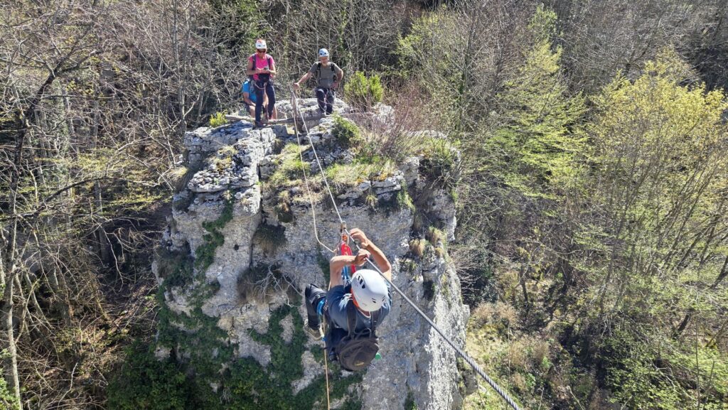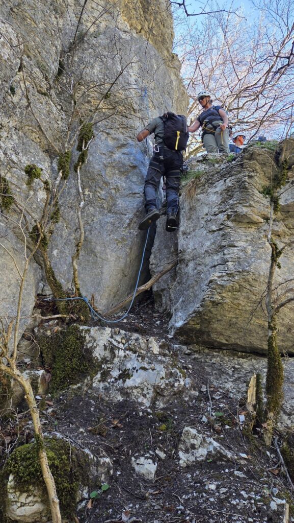 L’après midi commence par une marche en bord de falaise, par une sente défrichée récemment, qui nous ramène sur les pistes qui parcourent le plateau. Nous empruntons ces pistes en longeant les falaises au dessus de la Buisse jusqu’à deviner, entre les arbres, la tour Rolland. Une sente descends vers la tour. Quelques mètres d’escalade permettent de monter sur le piton qui fait face à la tour Rolland. Sur le piton, un câble horizontal permet de rejoindre la tour par une petite tyrolienne sympathique. Bonne nouvelle, les poulies spéléo sont de la bonne dimension pour ce câble. Après avoir admiré le paysage, nous redescendons la tour par quelques cordes (et deux pédales) pour rejoindre la gorge. La gorge, raide, se descends par une série de cordes (attention aux pierres), pour enfin rejoindre la vire du trou noir.