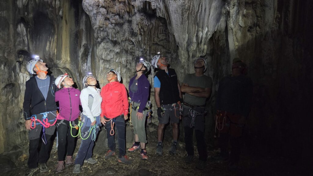 Nous parcourons cette vire facile et aérienne jusqu’à atteindre la grotte du trou noir. Nous visitons cette grotte, magnifiquement ornée ce qui est rare en Chartreuse.
