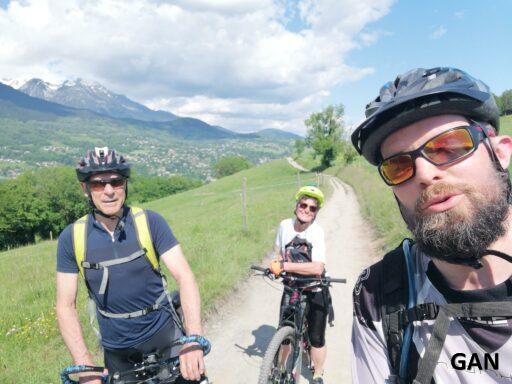 Heureusement nous arrivons quand même au col des quatre seigneurs, duquel nous pouvons attaquer la première descente bien sympa. Descendus à Herbeys, nous remontons par la route jusqu’à Villeneuve pour attaquer la traversée de la crête. Maurice qui ne connaissait pas ce chemin en prend plein les mirettes. Les prés sont bien verts et fleuris, Belledonne est bien enneigée, et les vaches bien paisibles. La beauté de ce panorama fait que nous sommes par contre obligés de partager le chemin avec beaucoup de piétons. Mais nous ne roulons pas bien vite de toute manière avec cette chaleur.