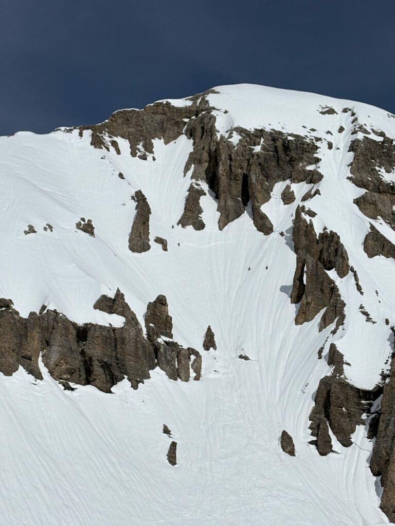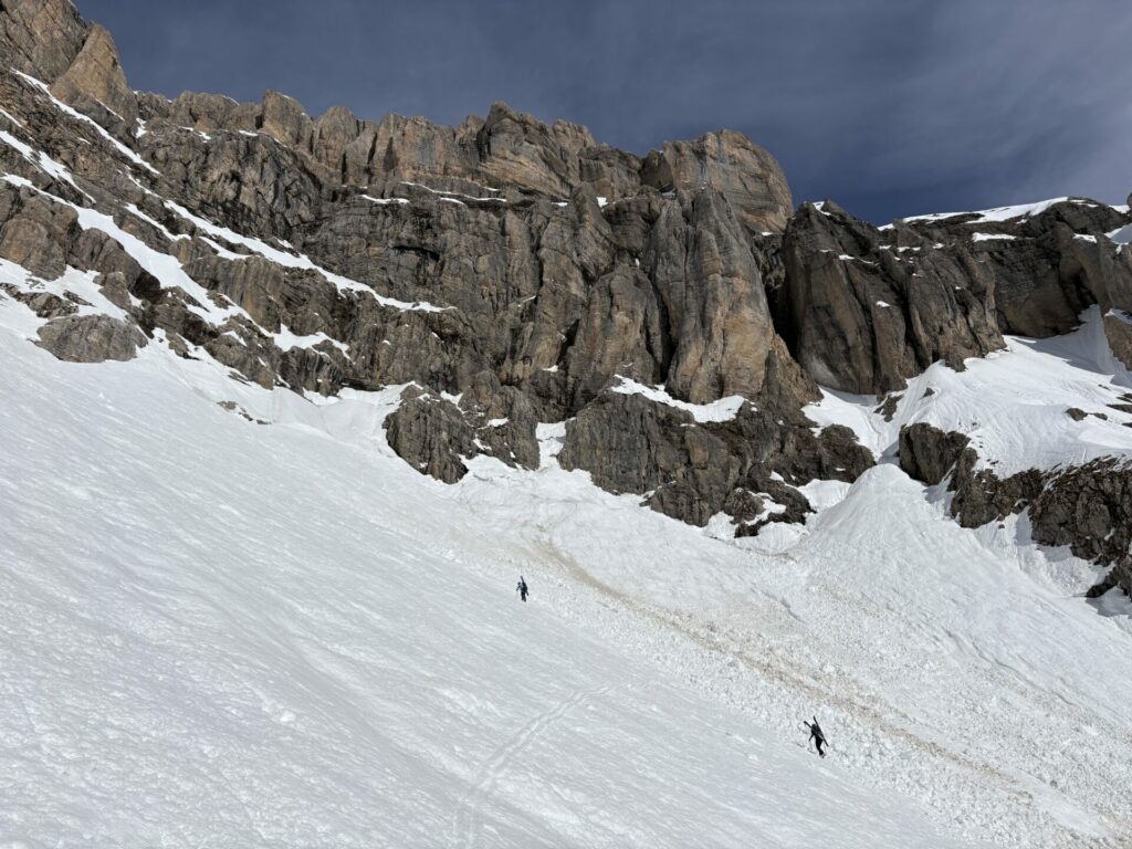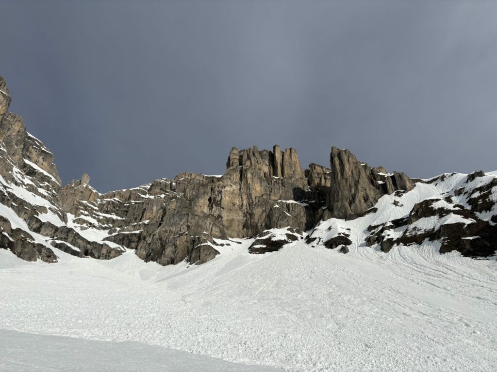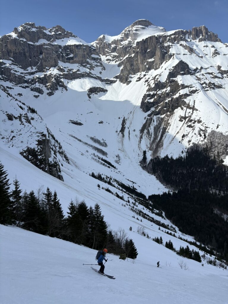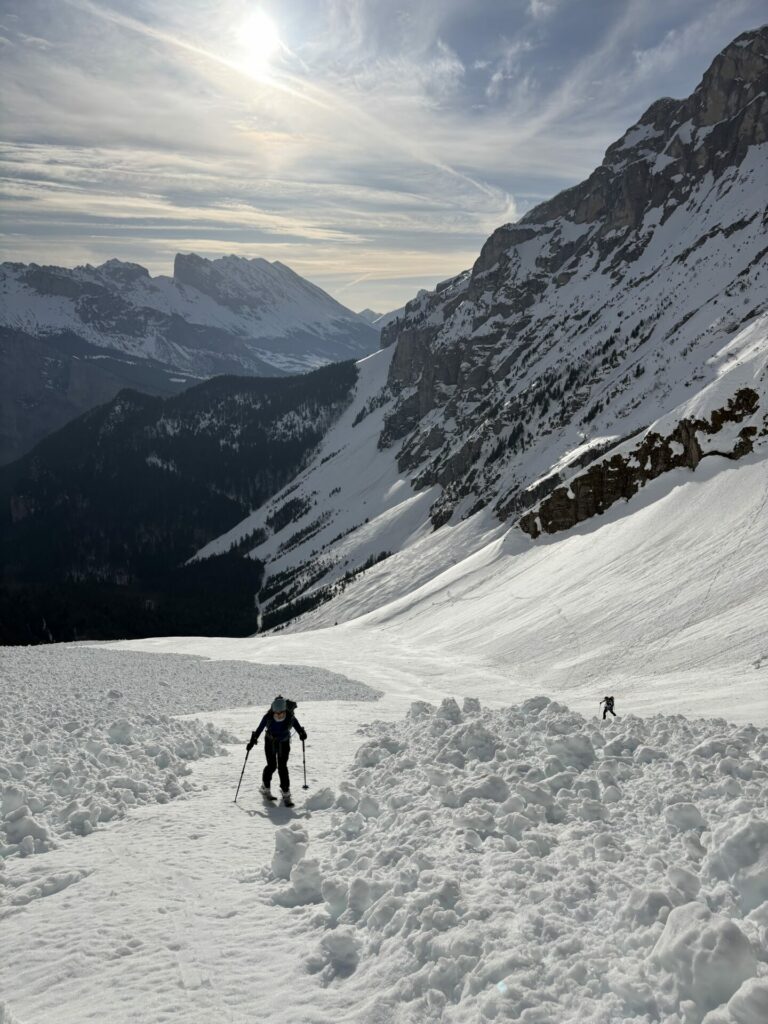 Au débouché de la combe de la fuvelle, celle-ci est également ravagé par des avalanches. L’équipe de 4 qui ont un programme +2600 enchaîne en crampons, pascale et Stéphanie les suivent. Moi je suis trop lourd, impossible d’avancée dans cette neige trempée, je repart avec les ski.