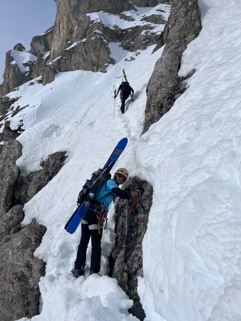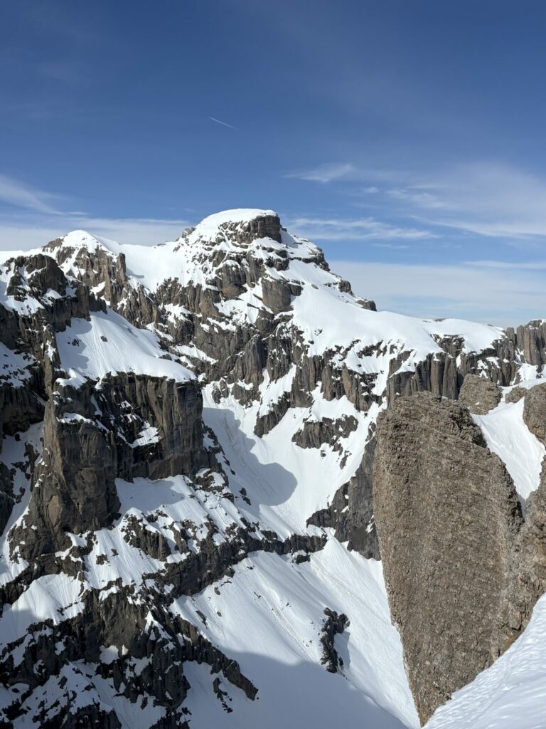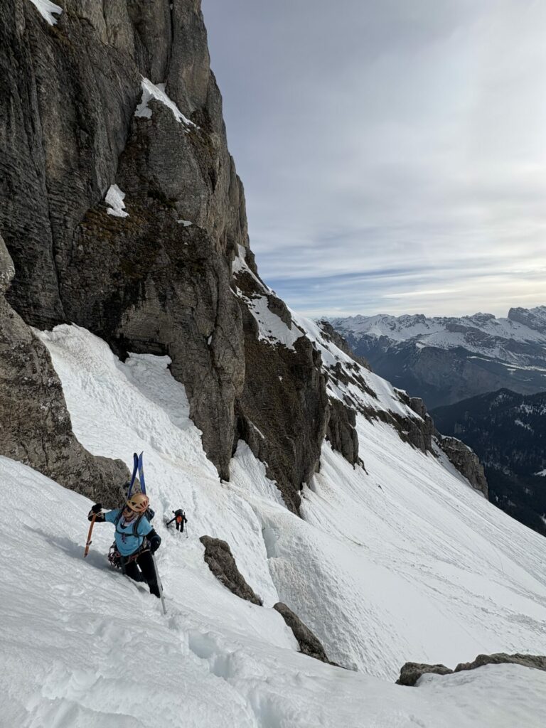 Je retrouve mes équipières sur la bosse entrain d’observer l’équipe de quatre dans le couloir de la Fuvelle. Superbe panorama sur la tête de la cavale et le bonnet de l’évêque.