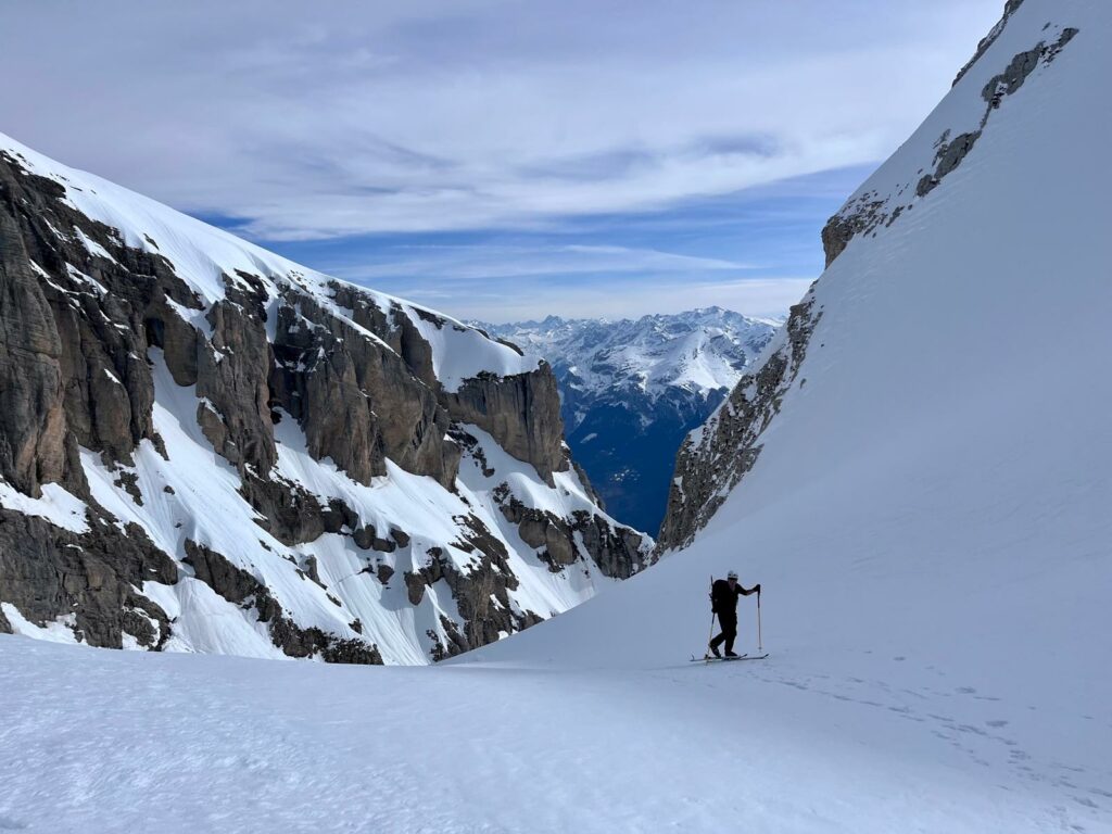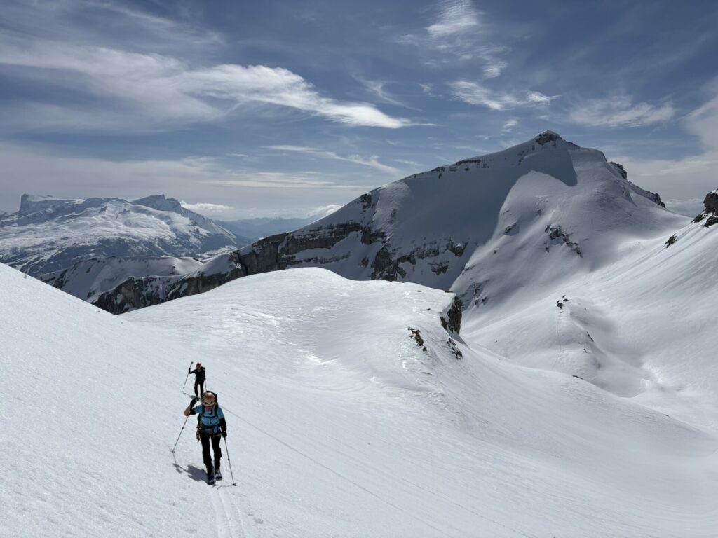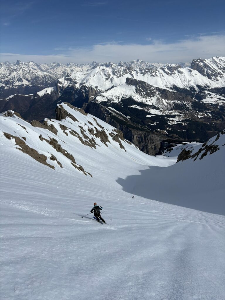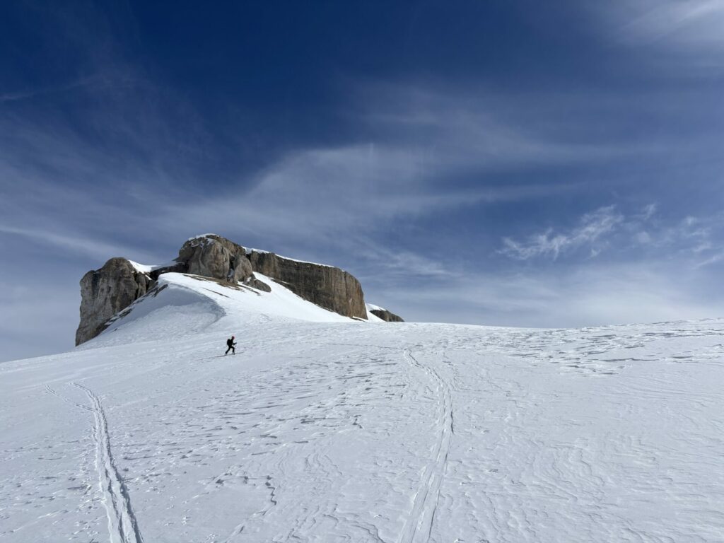 Nous rejoignons le col de la Fuvelle, puis superbe descente jusqu’à la combe de la Prison vierge de trace. Notre objectif nous surplombe il nous reste encore +400m pour atteindre la Tête de Lapras. Une belle trace nous amène d’abort au col puis zigzag dans une pente à 30° plein sud.