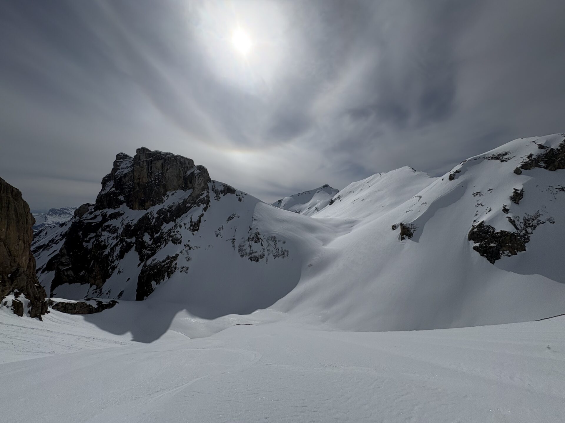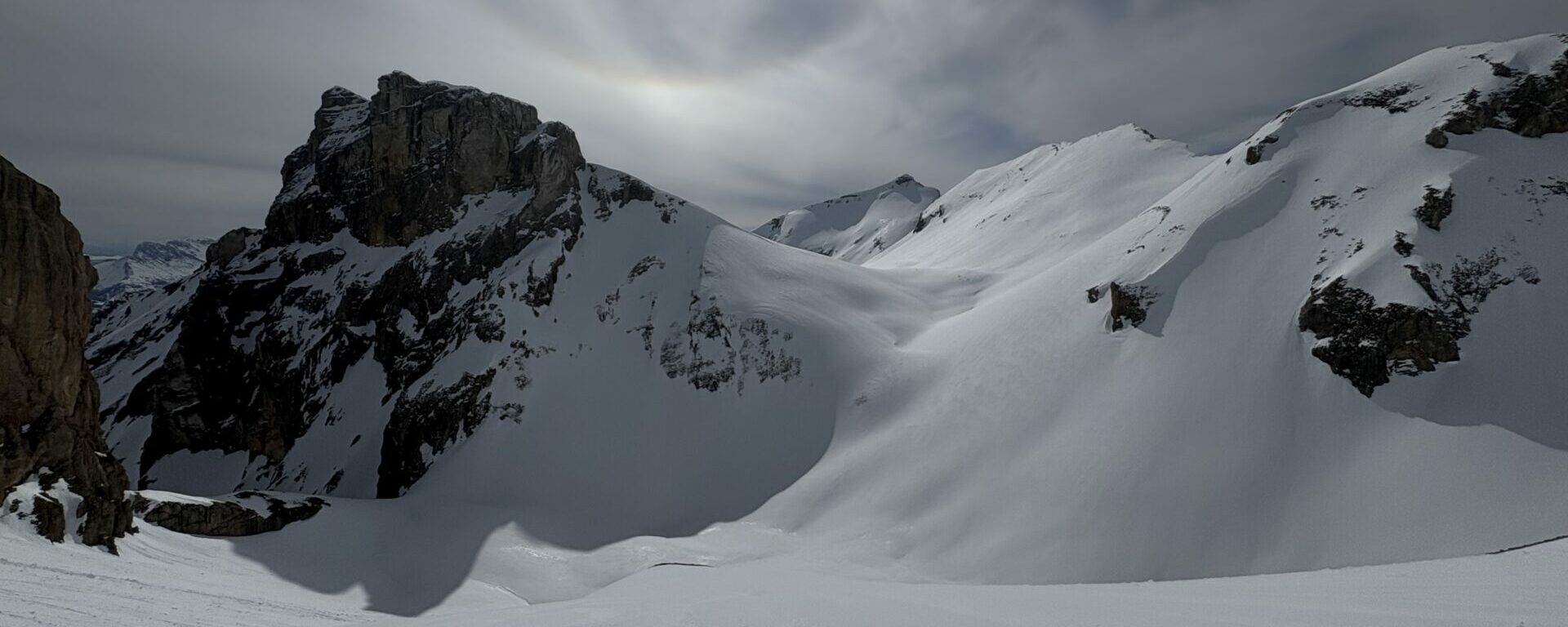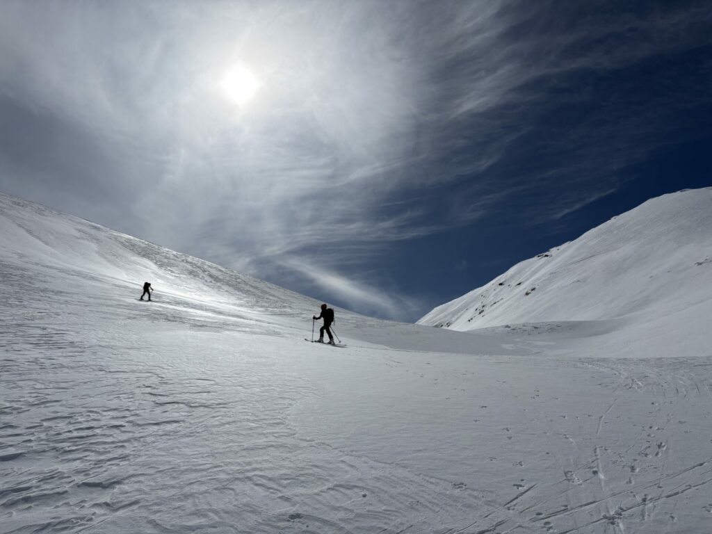 Nous rejoignons le col de la Fuvelle, puis superbe descente jusqu’à la combe de la Prison vierge de trace. Notre objectif nous surplombe il nous reste encore +400m pour atteindre la Tête de Lapras. Une belle trace nous amène d’abort au col puis zigzag dans une pente à 30° plein sud.