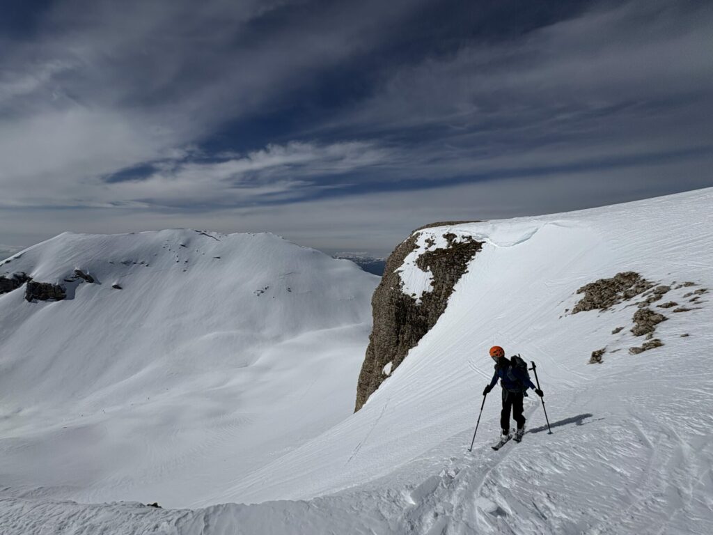 Arrivée au sommet à 13h10, on reprend des forces avant de plonger dans la combe du Pivallon toujours aussi agréable à skier. On contourne la Tête des Ombres, une traversée nous amène un peu trop bas pour rejoindre directement la pente en direction de la piste du sappey.