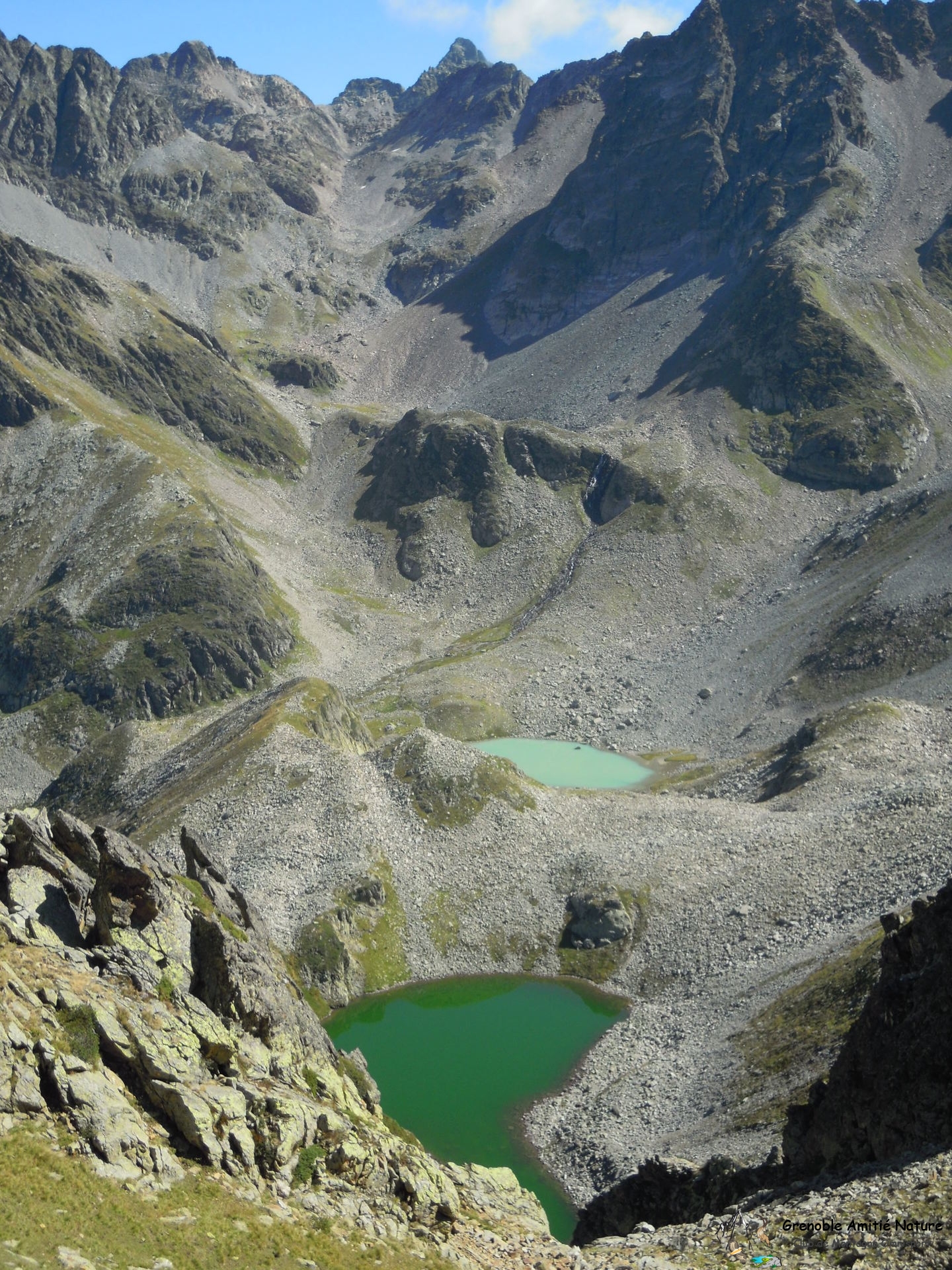 De là, nous plongeons, direction plein Est, dans un petit vallon relativement raide, hors sentier, qui nous amène jusqu’au lac de la Folle, un lac d’un vert émeraude étonnant à cette altitude, alors qu’à 15 min de celui-ci nous longeons le lac Blanc, de couleur laiteuse.