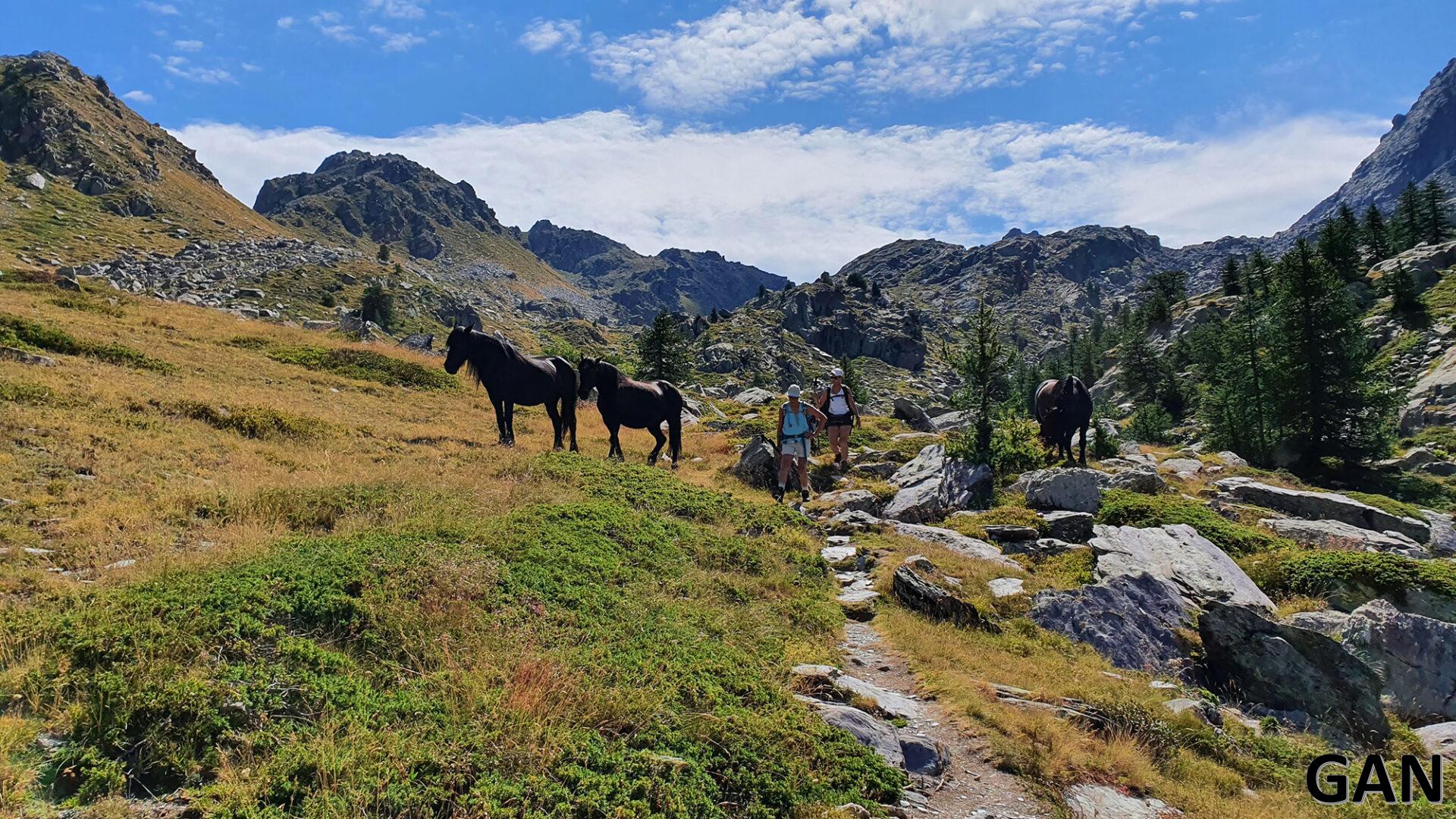 De retour au Pas du Trem, la descente peut commencer. Comme le gardien l’avait indiqué, un maigre sentier est tracé et des cairns permettent de cheminer dans le dédale de blocs granitiques, vestiges d’anciennes moraines. Sortis de la caillasse, nous croisons un troupeau de magnifiques chevaux en liberté, puis le sentier de plus en plus marqué nous ramène tranquillement à nos voitures.