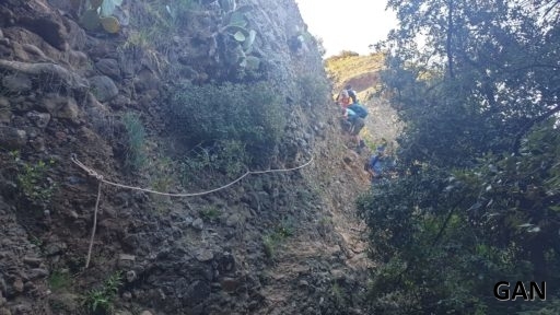 Courte pause, et nous remontons environ 100 m pour contourner la falaise des « toits infranchissable ».