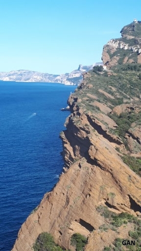 Ici le très beau belvédère permet d’embrasser toute la côte de la Ciotat jusqu’aux dernières calanques avant Marseille. A partir de ce point culminant, le sentier (GR51/ GR98) poursuit son long cheminement en balcon au-dessus de la côte, et nous sommes dominés par de belles falaises calcaires. La calanque de Sormiou, que nous dominons, s’ouvre devant nous, avec son joli petit port.