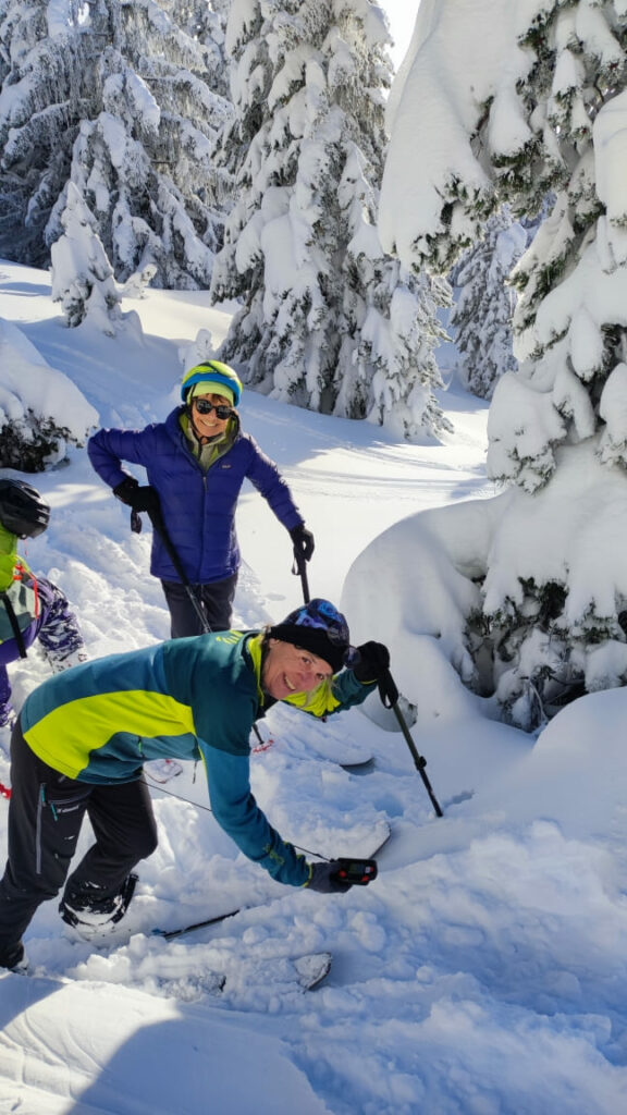 Sur la descente dans une neige 5*, nous prenons le temps de discuter et pratiquer les exercices de recherches DVA, en brassant un maximum dans la poudreuse profonde!