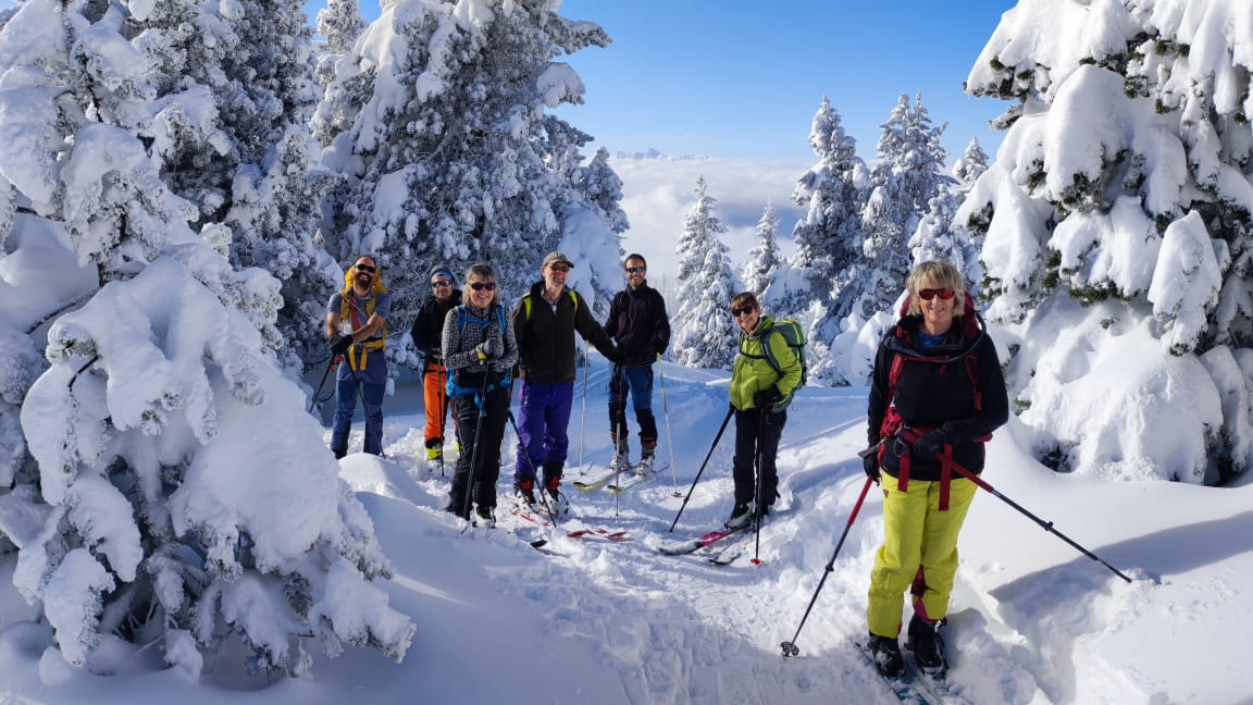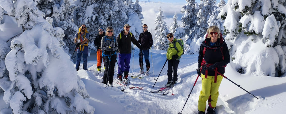 Sur la descente dans une neige 5*, nous prenons le temps de discuter et pratiquer les exercices de recherches DVA, en brassant un maximum dans la poudreuse profonde!