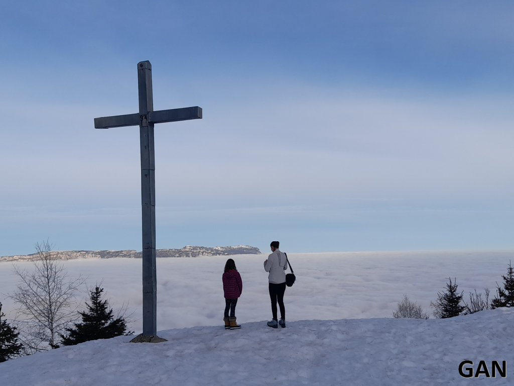 À notre arrivée au refuge, c’était la ruée vers les lits superposés. Les enfants ont conquis les meilleures places avec une énergie débordante. Ils avaient un instinct de félins : préempter les positions douillettes et surplombantes ! Le refuge, accueillant et chaleureux comme son équipe de bénévoles (un peu débordés par les commandes), offrait un parfait havre de paix. Le soir, belle tablée autour d’une croziflette pour certains ou d’une fondue pour d’autres ! Et magnifique crépuscule, depuis la croix au dessus de refuge, plus haut que la mer de nuages sous laquelle étaient enfouis les grenoblois.
